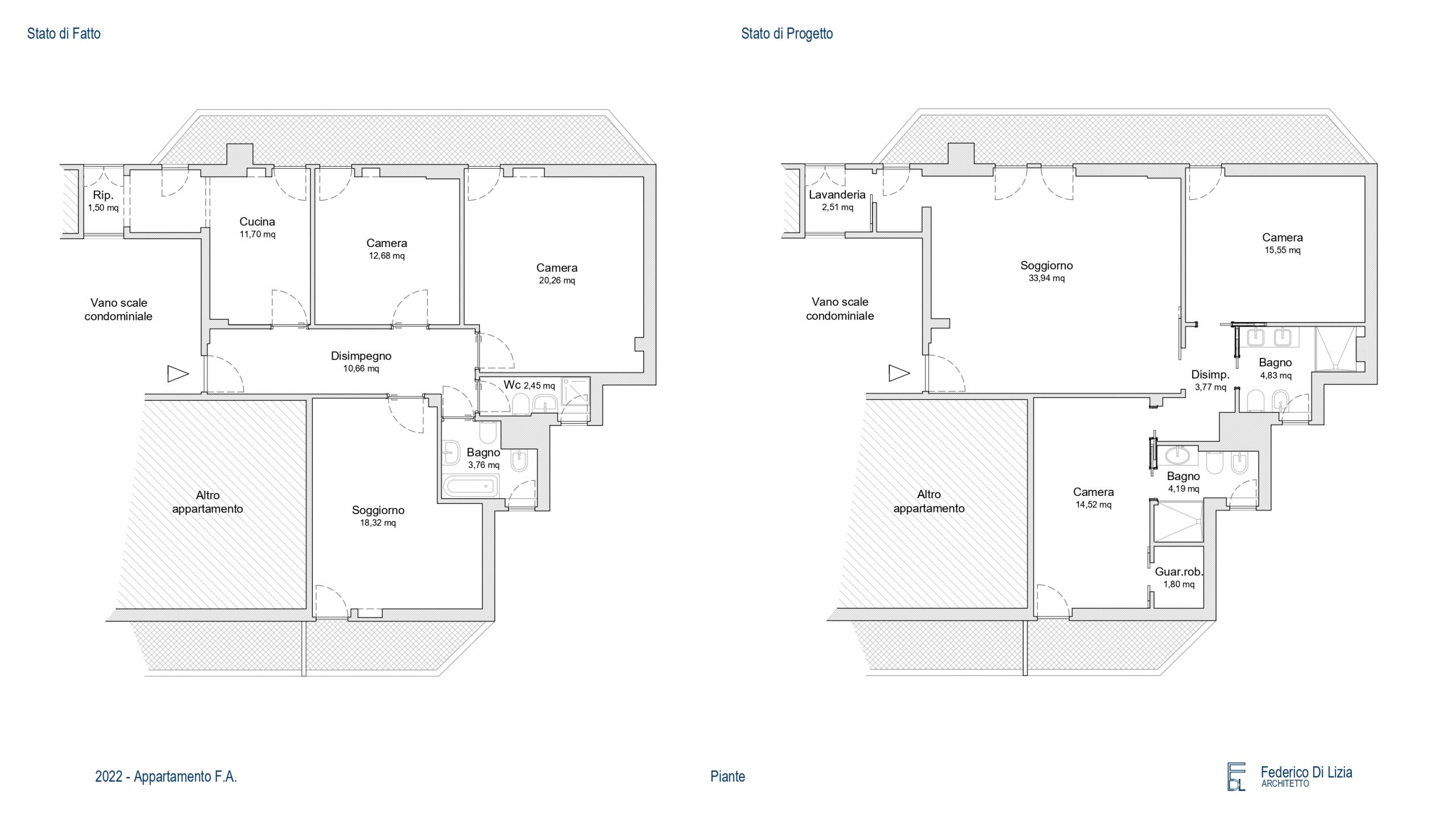 La situazione di partenza è un tipico appartamento degli anni 60; in cui troviamo una camera da letto sovradimensionata, tanto spazio occupato dal disimpegno e dei bagni molto sacrificati.